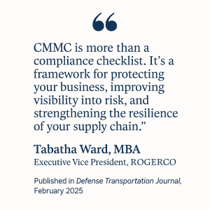 ROGERCO’s Executive Vice President, Tabatha Ward, MBA, was recently published in the February 2025 issue of the Defense Transportation Journal, a publication of the National Defense Transportation Association (NDTA). Her article, titled “Why is CMMC Good for Business?,” explores how the Cybersecurity Maturity Model Certification (CMMC) framework supports not only compliance efforts, but also broader organizational health.